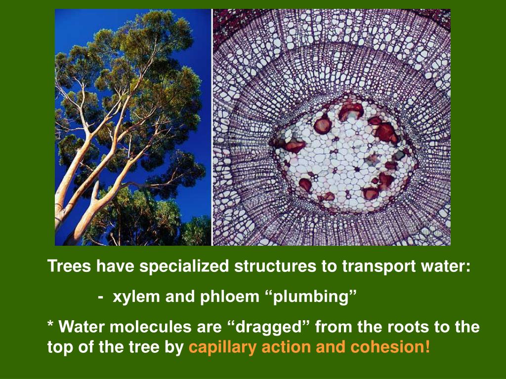 Trees have specialized structures to transport water: - xylem and phloem “plumbing” * Water molecules are “dragged” from the roots to the top of the tree by capillary action and cohesion!