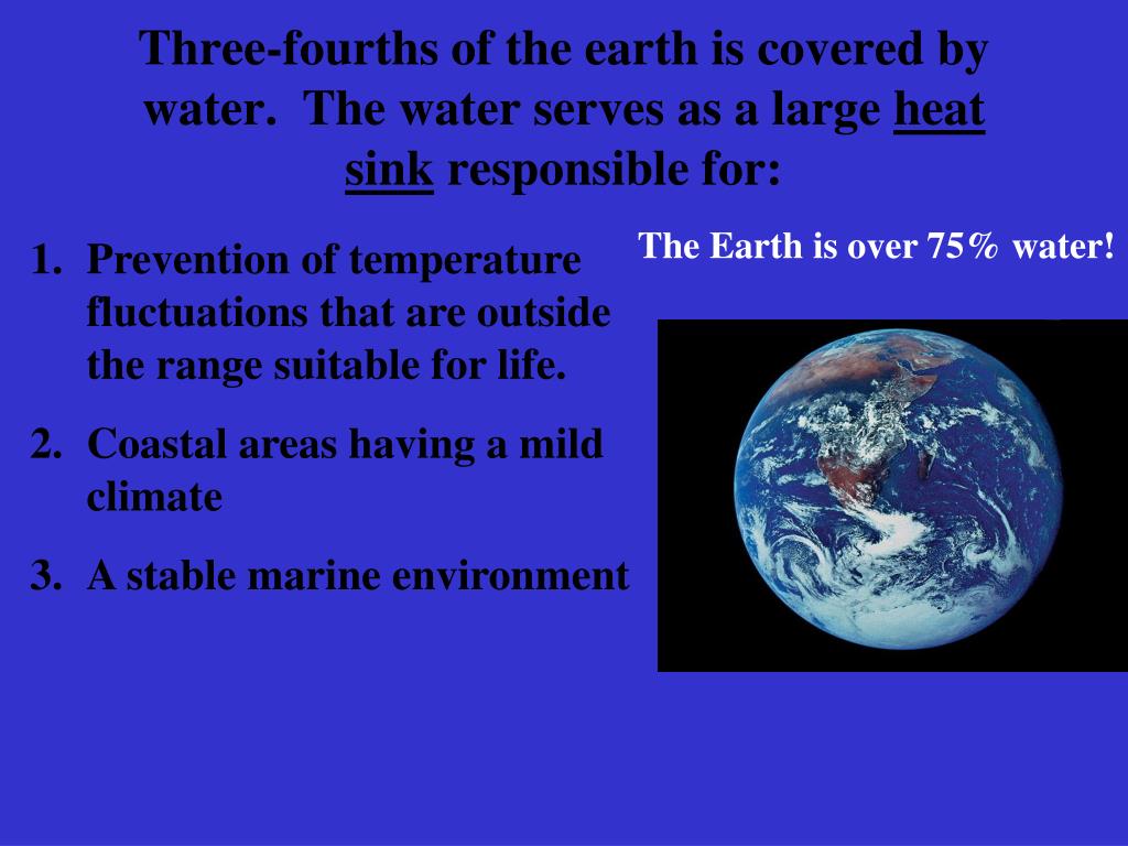 Three-fourths of the earth is covered by water. The water serves as a large heat sink responsible for: The Earth is over 75% water! • Prevention of temperature fluctuations that are outside the range suitable for life. • Coastal areas having a mild climate • A stable marine environment