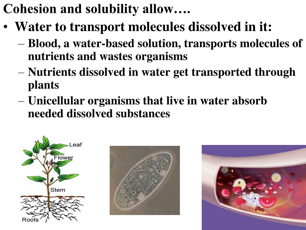 Cohesion and solubility allow…. Water to transport molecules dissolved in it: Blood, a water-based solution, transports molecules of nutrients and wastes organisms Nutrients dissolved in water get transported through plants Unicellular organisms that live in water absorb needed dissolved substances