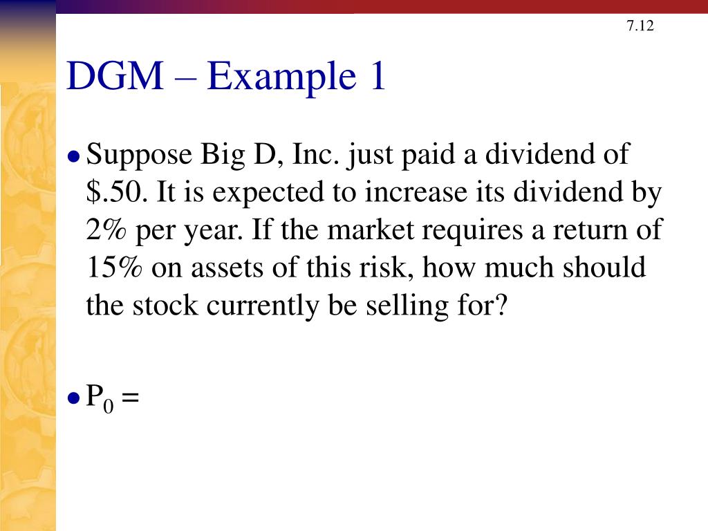 DGM – Example 1 • Suppose Big D, Inc. just paid a dividend of $.50. It is expected to increase its dividend by 2% per year. If the market requires a return of 15% on assets of this risk, how much should the stock currently be selling for? • P0 =