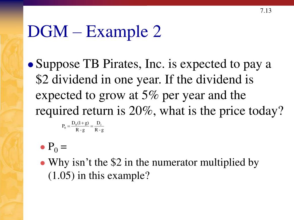 DGM – Example 2 • Suppose TB Pirates, Inc. is expected to pay a $2 dividend in one year. If the dividend is expected to grow at 5% per year and the required return is 20%, what is the price today? • P0 = • Why isn’t the $2 in the numerator multiplied by (1.05) in this example?