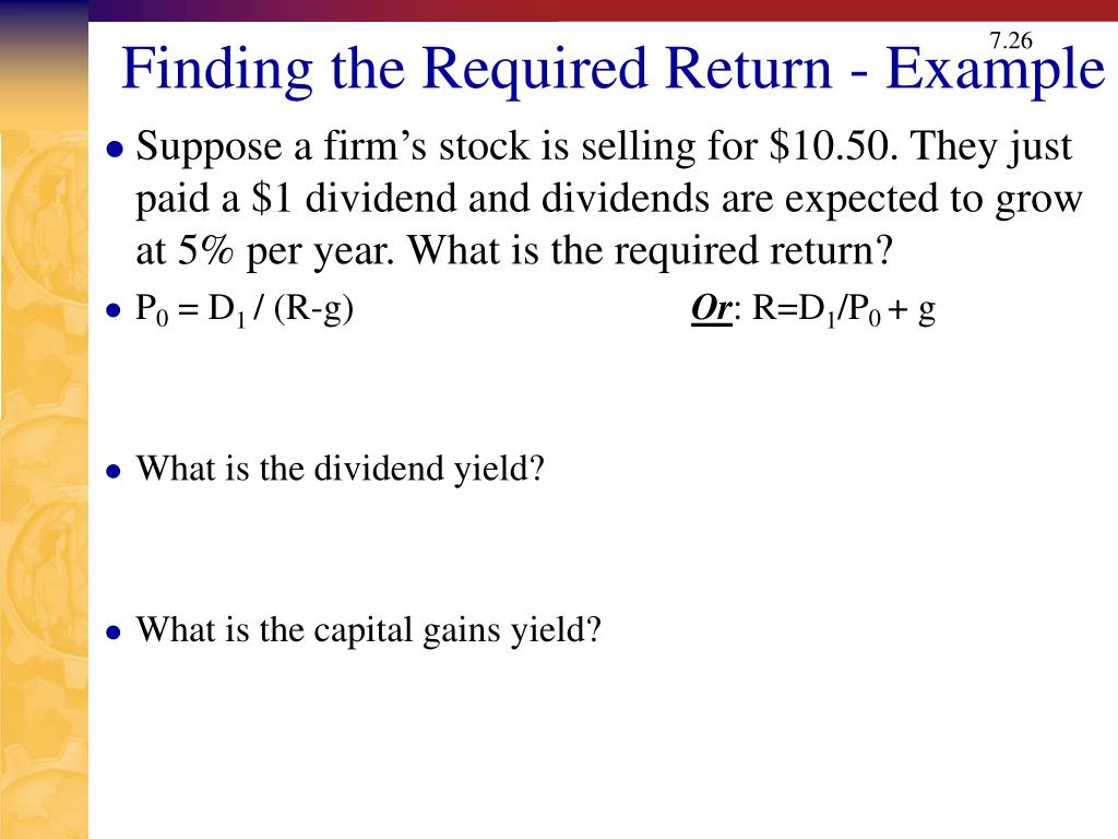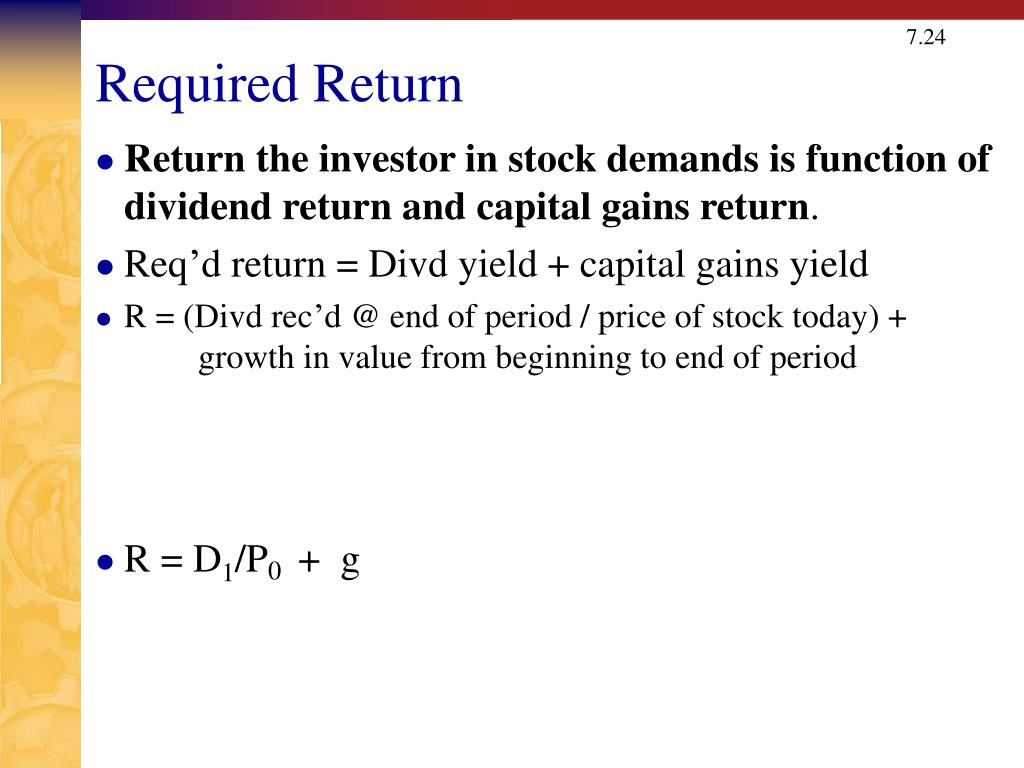 Required Return • Return the investor in stock demands is function of dividend return and capital gains return. • Req’d return = Divd yield + capital gains yield • R = (Divd rec’d @ end of period / price of stock today) + growth in value from beginning to end of period • R = D1/P0 + g