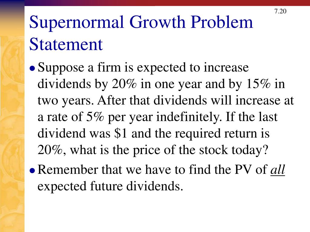 Supernormal Growth Problem Statement • Suppose a firm is expected to increase dividends by 20% in one year and by 15% in two years. After that dividends will increase at a rate of 5% per year indefinitely. If the last dividend was $1 and the required return is 20%, what is the price of the stock today? • Remember that we have to find the PV of all expected future dividends.