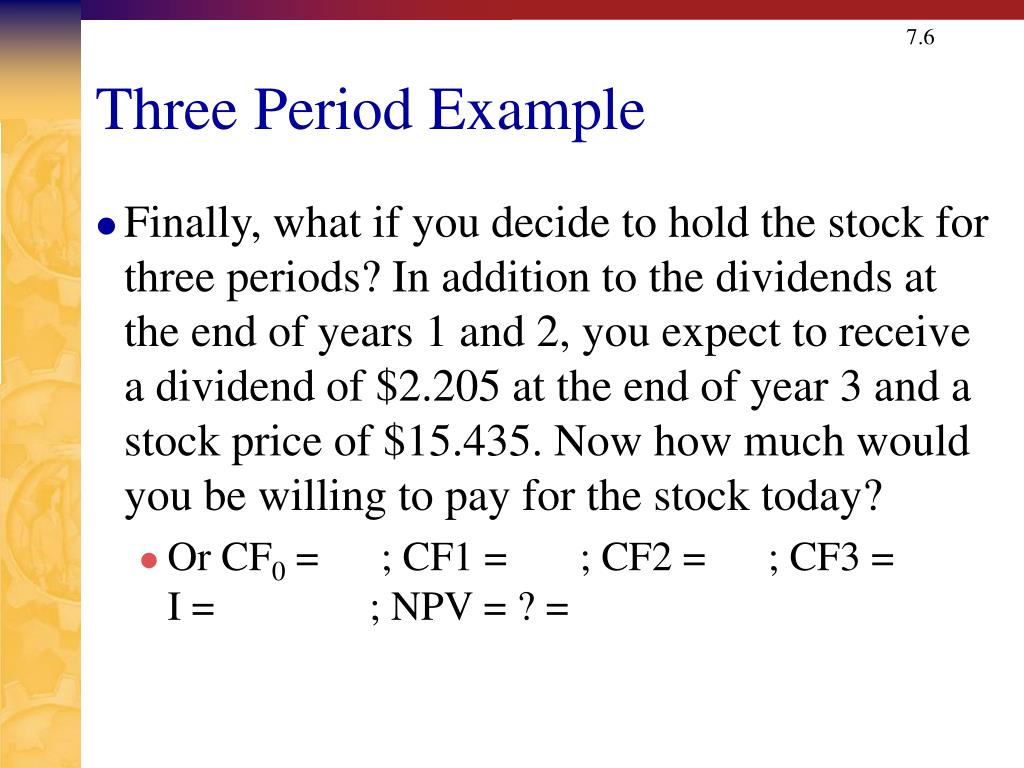 Three Period Example • Finally, what if you decide to hold the stock for three periods? In addition to the dividends at the end of years 1 and 2, you expect to receive a dividend of $2.205 at the end of year 3 and a stock price of $15.435. Now how much would you be willing to pay for the stock today? • Or CF0 = ; CF1 = ; CF2 = ; CF3 = I = ; NPV = ? =
