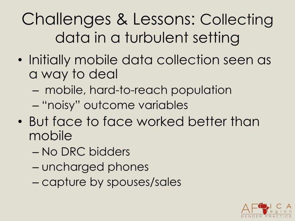 Challenges & Lessons: Collecting data in a turbulent setting • Initially mobile data collection seen as a way to deal • mobile, hard-to-reach population • “noisy” outcome variables • But face to face worked better than mobile • No DRC bidders • uncharged phones • capture by spouses/sales