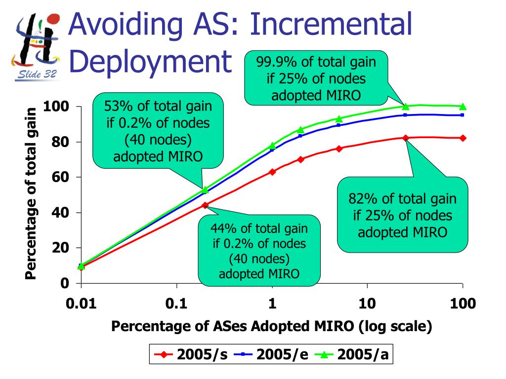 Avoiding AS: Incremental Deployment 99.9% of total gain if 25% of nodes adopted MIRO 53% of total gain if 0.2% of nodes (40 nodes) adopted MIRO 82% of total gain if 25% of nodes adopted MIRO 44% of total gain if 0.2% of nodes (40 nodes) adopted MIRO