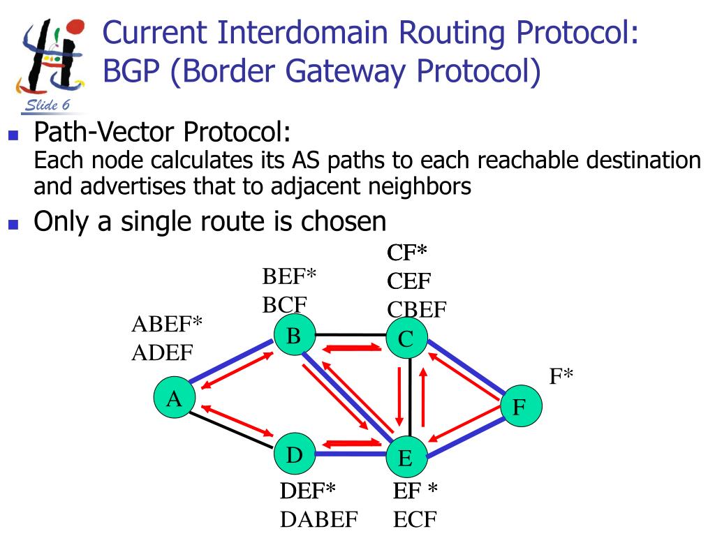 Current Interdomain Routing Protocol: BGP (Border Gateway Protocol) Path-Vector Protocol:Each node calculates its AS paths to each reachable destination and advertises that to adjacent neighbors Only a single route is chosen CF* CF*CEFCBEF CF*CEF BEF*BCF ABEF*ADEF DEF* EF *ECF EF * B C F* A F D E DEF*DABEF