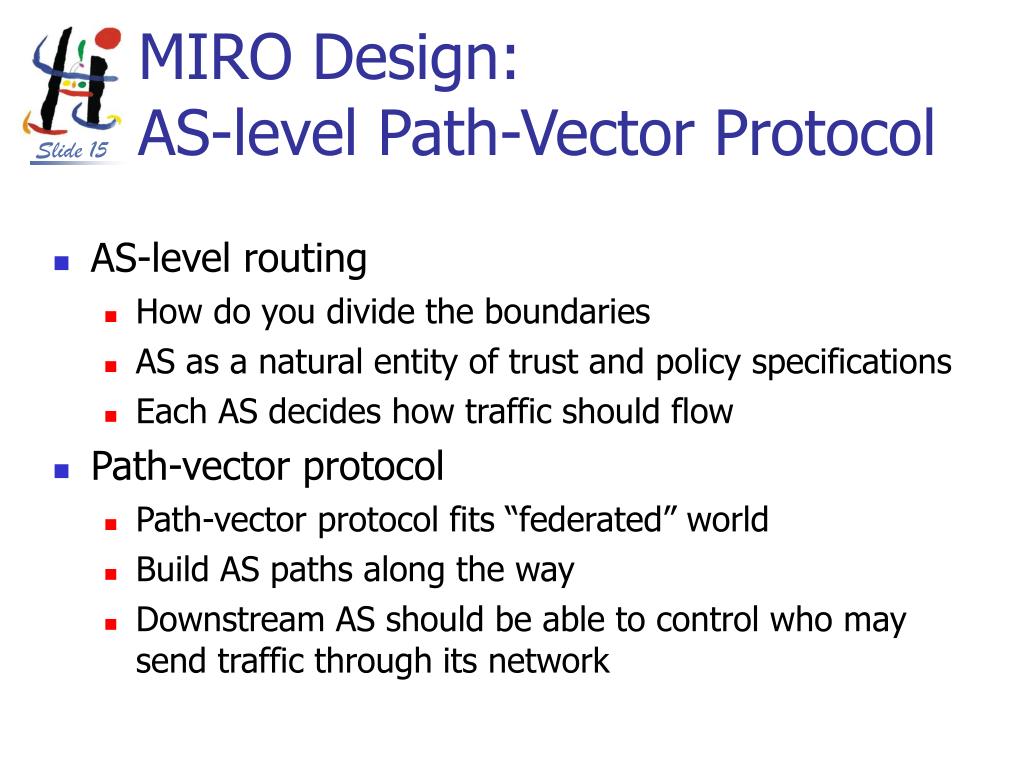 MIRO Design: AS-level Path-Vector Protocol AS-level routing How do you divide the boundaries AS as a natural entity of trust and policy specifications Each AS decides how traffic should flow Path-vector protocol Path-vector protocol fits “federated” world Build AS paths along the way Downstream AS should be able to control who may send traffic through its network