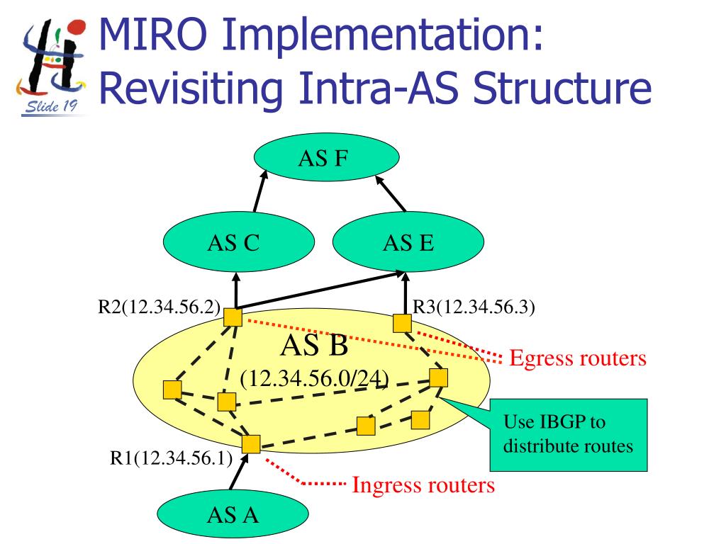 MIRO Implementation: Revisiting Intra-AS Structure AS F AS C AS E R2(12.34.56.2) R3(12.34.56.3) AS B(12.34.56.0/24) Egress routers Use IBGP todistribute routes R1(12.34.56.1) Ingress routers AS A
