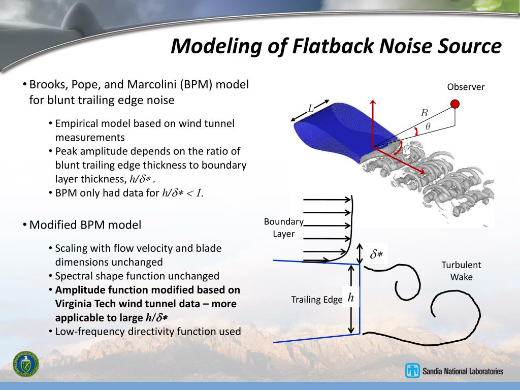 Modeling of Flatback Noise Source • Brooks, Pope, and Marcolini (BPM) model for blunt trailing edge noise • Empirical model based on wind tunnel measurements • Peak amplitude depends on the ratio of blunt trailing edge thickness to boundary layer thickness, h/d* . • BPM only had data for h/d* < 1. • Modified BPM model • Scaling with flow velocity and blade dimensions unchanged • Spectral shape function unchanged • Amplitude function modified based on Virginia Tech wind tunnel data – more applicable to large h/d* • Low-frequency directivity function used Observer Boundary Layer d* Turbulent Wake h Trailing Edge