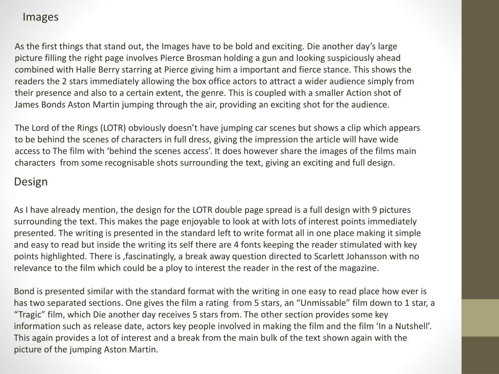Images As the first things that stand out, the Images have to be bold and exciting. Die another day’s large picture filling the right page involves Pierce Brosman holding a gun and looking suspiciously ahead combined with Halle Berry starring at Pierce giving him a important and fierce stance. This shows the readers the 2 stars immediately allowing the box office actors to attract a wider audience simply from their presence and also to a certain extent, the genre. This is coupled with a smaller Action shot of James Bonds Aston Martin jumping through the air, providing an exciting shot for the audience. The Lord of the Rings (LOTR) obviously doesn’t have jumping car scenes but shows a clip which appears to be behind the scenes of characters in full dress, giving the impression the article will have wide access to The film with ‘behind the scenes access’. It does however share the images of the films main characters from some recognisable shots surrounding the text, giving an exciting and full design. Design As I have already mention, the design for the LOTR double page spread is a full design with 9 pictures surrounding the text. This makes the page enjoyable to look at with lots of interest points immediately presented. The writing is presented in the standard left to write format all in one place making it simple and easy to read but inside the writing its self there are 4 fonts keeping the reader stimulated with key points highlighted. There is ,fascinatingly, a break away question directed to Scarlett Johansson with no relevance to the film which could be a ploy to interest the reader in the rest of the magazine. Bond is presented similar with the standard format with the writing in one easy to read place how ever is has two separated sections. One gives the film a rating from 5 stars, an “Unmissable” film down to 1 star, a “Tragic” film, which Die another day receives 5 stars from. The other section provides some key information such as release date, actors key people involved in making the film and the film ‘In a Nutshell’. This again provides a lot of interest and a break from the main bulk of the text shown again with the picture of the jumping Aston Martin.