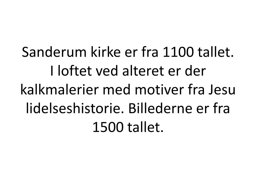 Sanderum kirke er fra 1100 tallet. I loftet ved alteret er der kalkmalerier med motiver fra Jesu lidelseshistorie. Billederne er fra 1500 tallet. På det første billede tages Jesu til fange og tornekrones.
