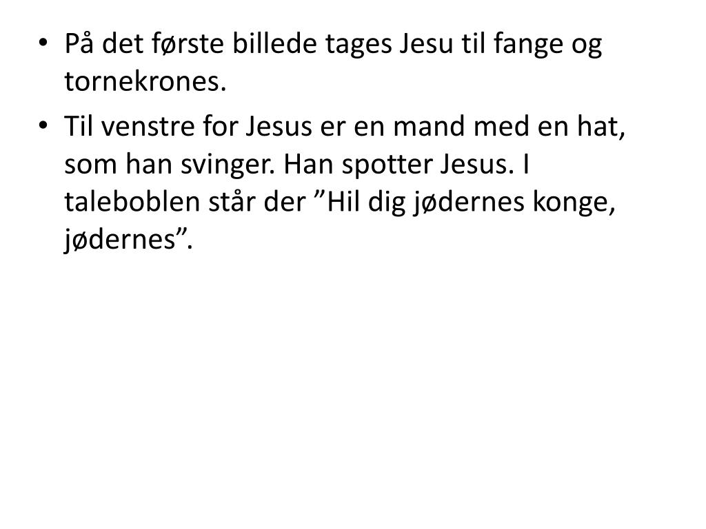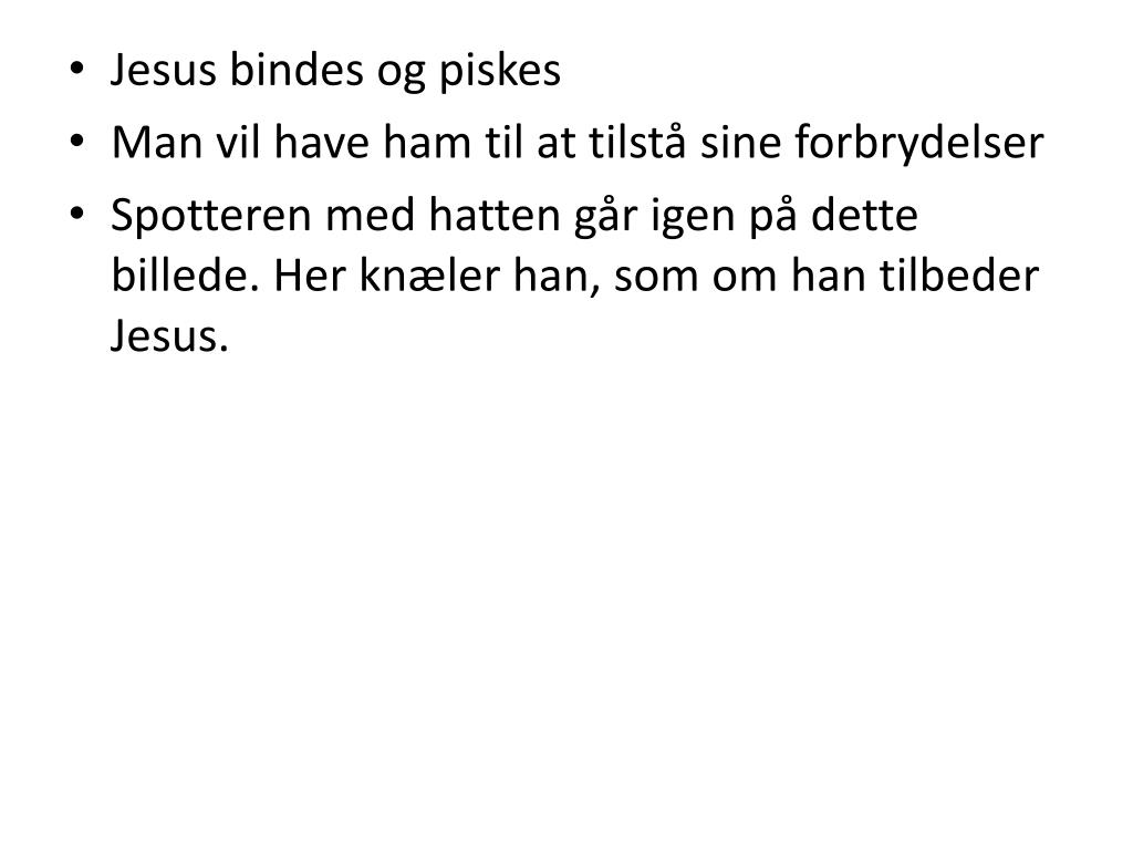 På det første billede tages Jesu til fange og tornekrones. • Til venstre for Jesus er en mand med en hat, som han svinger. Han spotter Jesus. I taleboblen står der ”Hil dig jødernes konge, jødernes”.