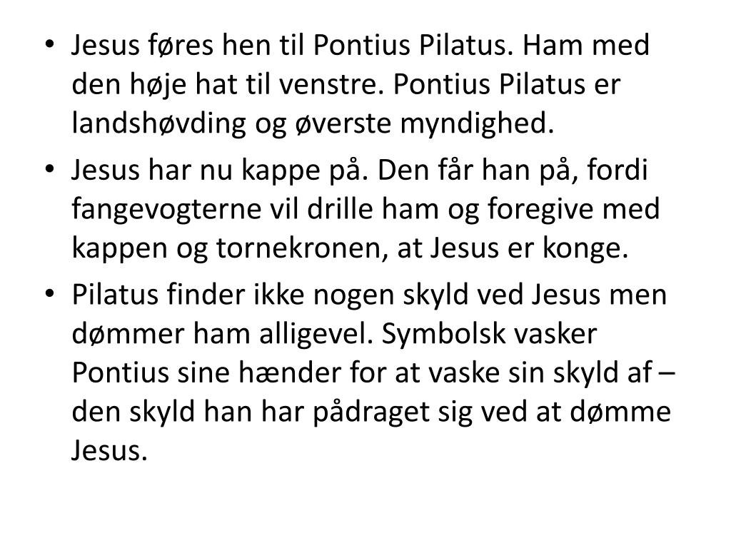 Jesus føres hen til Pontius Pilatus. Ham med den høje hat til venstre. Pontius Pilatus er landshøvding og øverste myndighed. • Jesus har nu kappe på. Den får han på, fordi fangevogterne vil drille ham og foregive med kappen og tornekronen, at Jesus er konge. • Pilatus finder ikke nogen skyld ved Jesus men dømmer ham alligevel. Symbolsk vasker Pontius sine hænder for at vaske sin skyld af – den skyld han har pådraget sig ved at dømme Jesus.