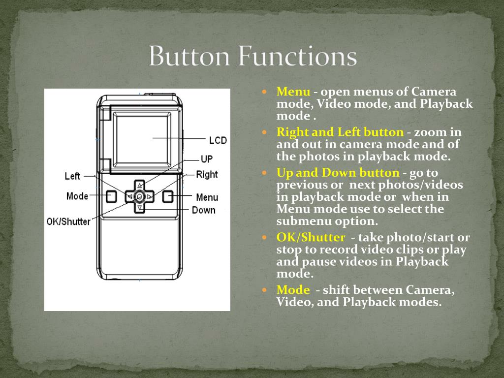 Button Functions • Menu - open menus of Camera mode, Video mode, and Playback mode . • Right and Left button - zoom in and out in camera mode and of the photos in playback mode. • Up and Down button - go to previous or next photos/videos in playback mode or when in Menu mode use to select the submenu option. • OK/Shutter - take photo/start or stop to record video clips or play and pause videos in Playback mode. • Mode - shift between Camera, Video, and Playback modes.