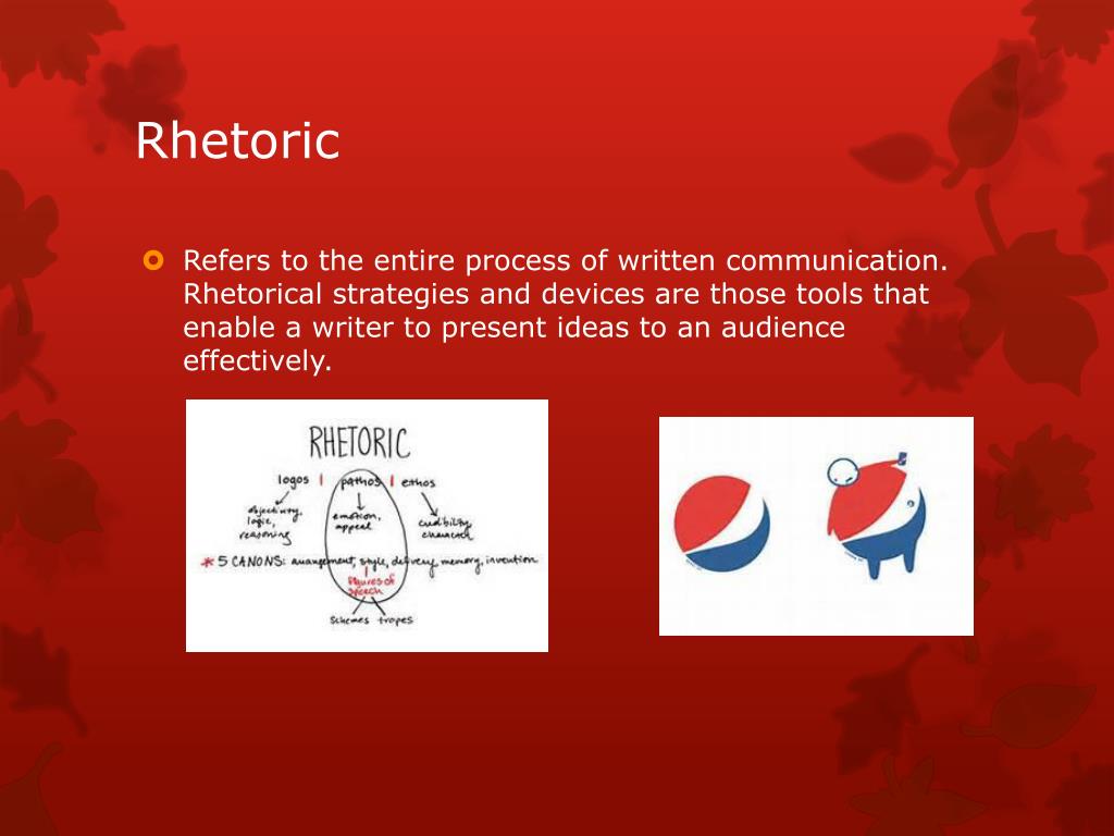Rhetoric • Refers to the entire process of written communication. Rhetorical strategies and devices are those tools that enable a writer to present ideas to an audience effectively.