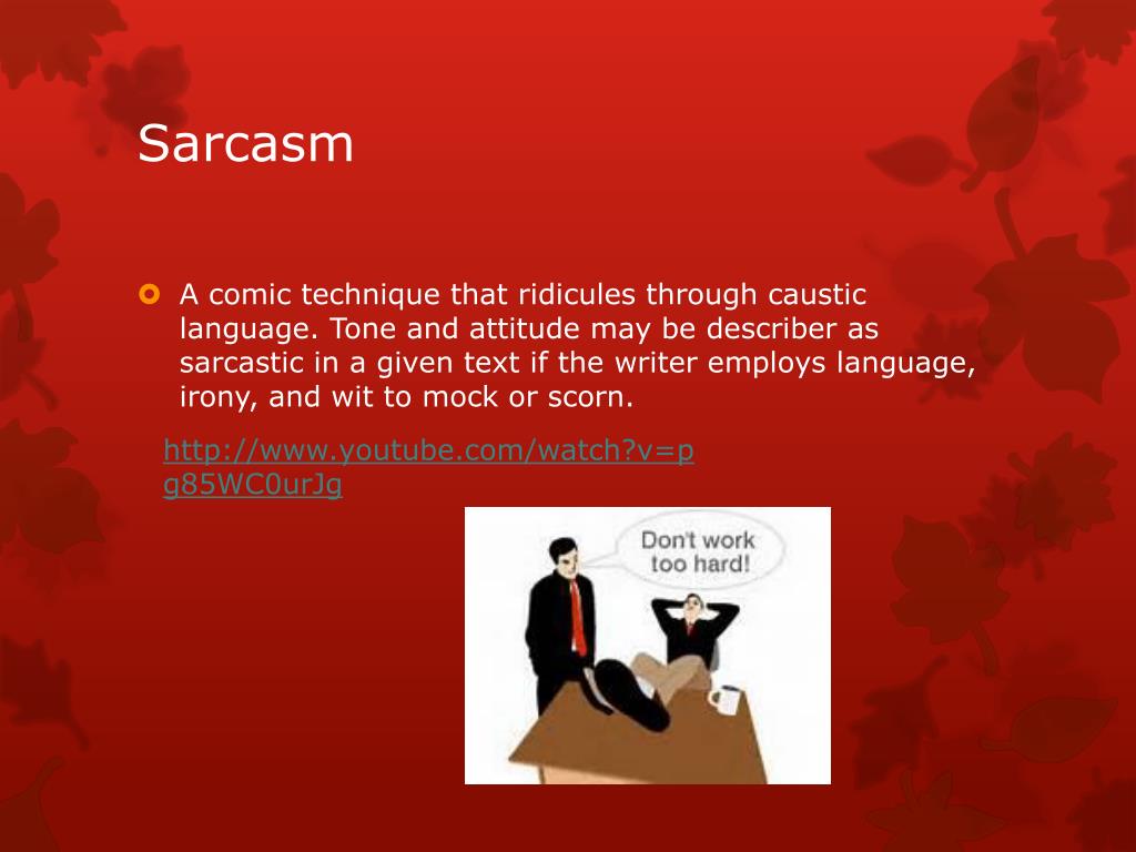 Sarcasm • A comic technique that ridicules through caustic language. Tone and attitude may be describer as sarcastic in a given text if the writer employs language, irony, and wit to mock or scorn. http://www.youtube.com/watch?v=pg85WC0urJg
