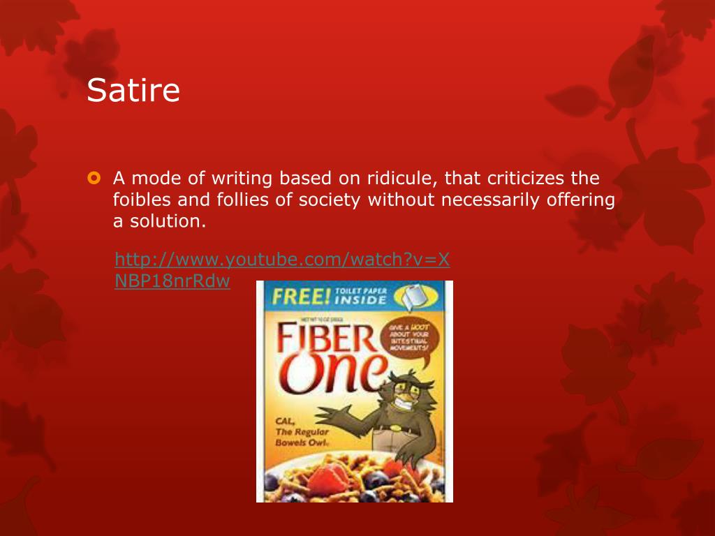 Satire • A mode of writing based on ridicule, that criticizes the foibles and follies of society without necessarily offering a solution. http://www.youtube.com/watch?v=XNBP18nrRdw