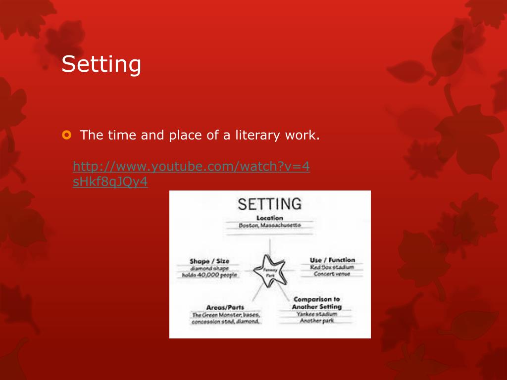 Setting • The time and place of a literary work. http://www.youtube.com/watch?v=4sHkf8qJQy4