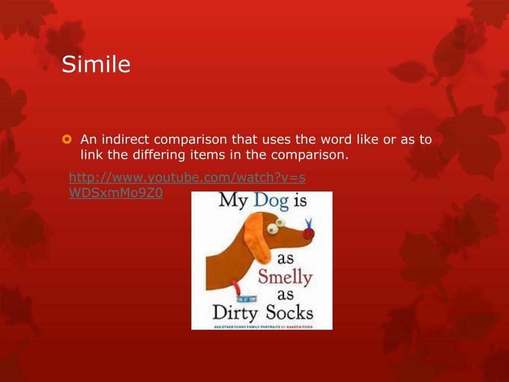 Simile • An indirect comparison that uses the word like or as to link the differing items in the comparison. http://www.youtube.com/watch?v=sWDSxmMo9Z0