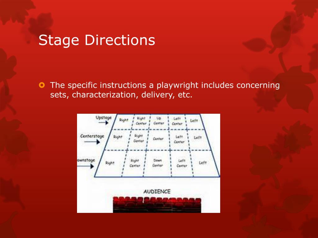 Stage Directions • The specific instructions a playwright includes concerning sets, characterization, delivery, etc.