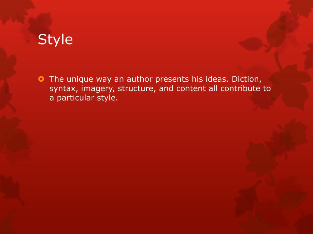 Style • The unique way an author presents his ideas. Diction, syntax, imagery, structure, and content all contribute to a particular style.