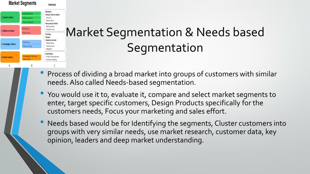 Market Segmentation & Needs based Segmentation Process of dividing a broad market into groups of customers with similar needs. Also called Needs-based segmentation. You would use it to, evaluate it, compare and select market segments to enter, target specific customers, Design Products specifically for the customers needs, Focus your marketing and sales effort. Needs based would be for Identifying the segments, Cluster customers into groups with very similar needs, use market research, customer data, key opinion, leaders and deep market understanding.