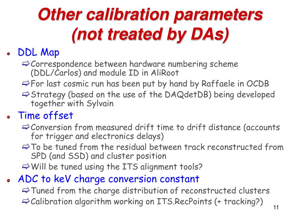 Other calibration parameters(not treated by DAs) • DDL Map • Correspondence between hardware numbering scheme (DDL/Carlos) and module ID in AliRoot • For last cosmic run has been put by hand by Raffaele in OCDB • Strategy (based on the use of the DAQdetDB) being developed together with Sylvain • Time offset • Conversion from measured drift time to drift distance (accounts for trigger and electronics delays) • To be tuned from the residual between track reconstructed from SPD (and SSD) and cluster position • Will be tuned using the ITS alignment tools? • ADC to keV charge conversion constant • Tuned from the charge distribution of reconstructed clusters • Calibration algorithm working on ITS.RecPoints (+ tracking?)