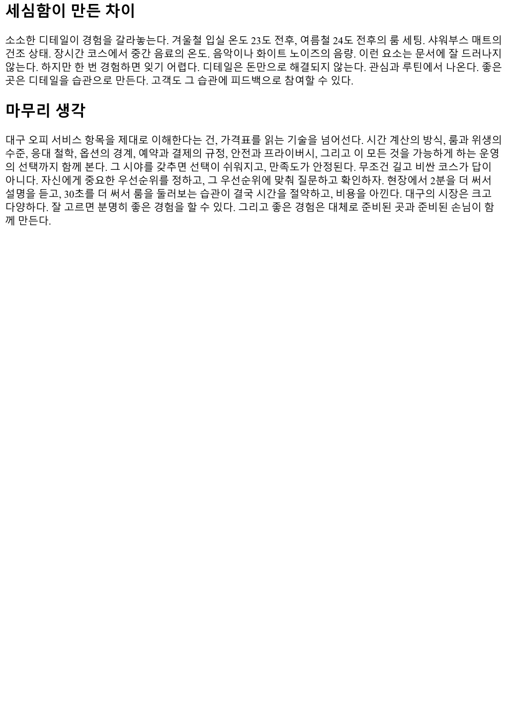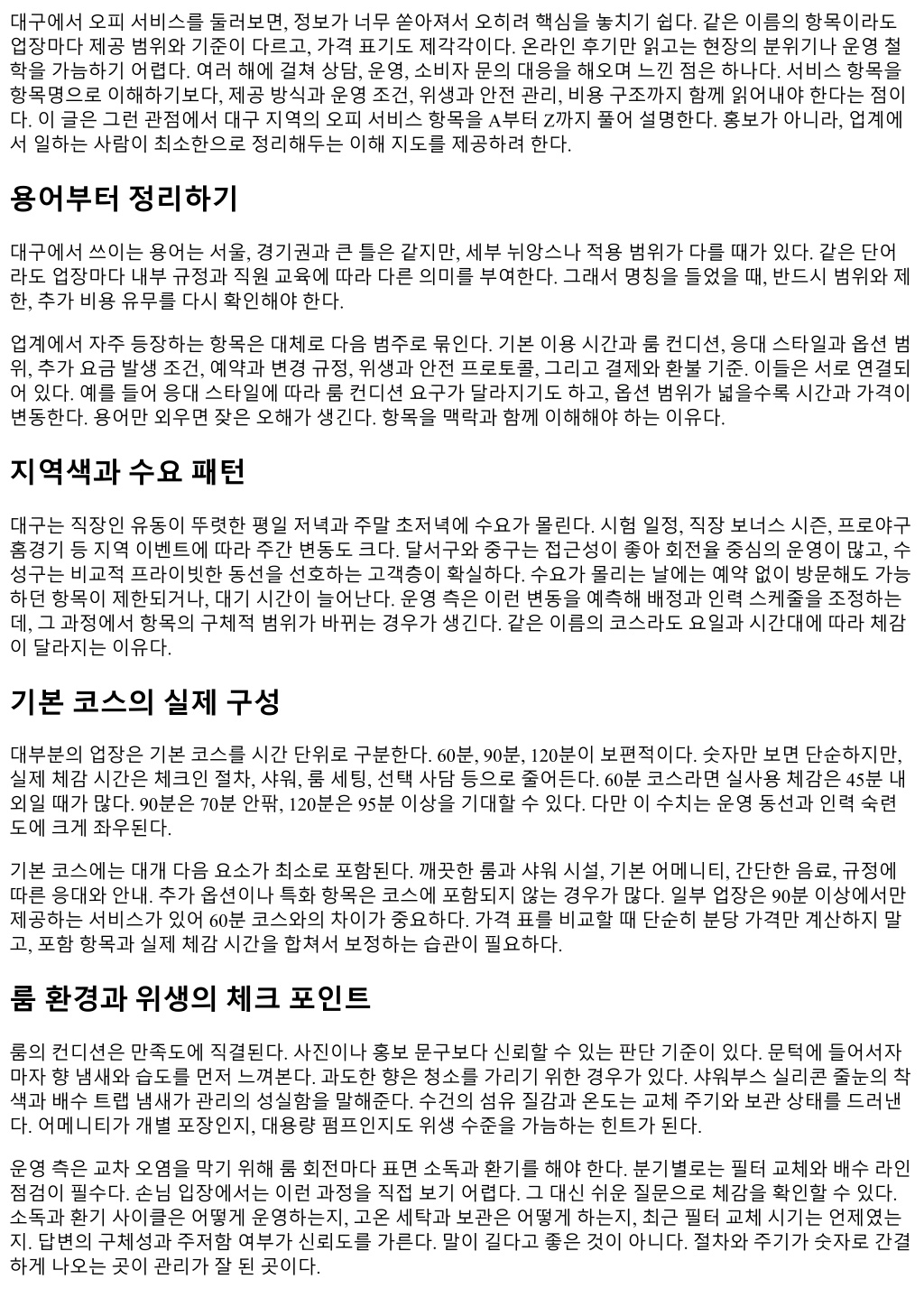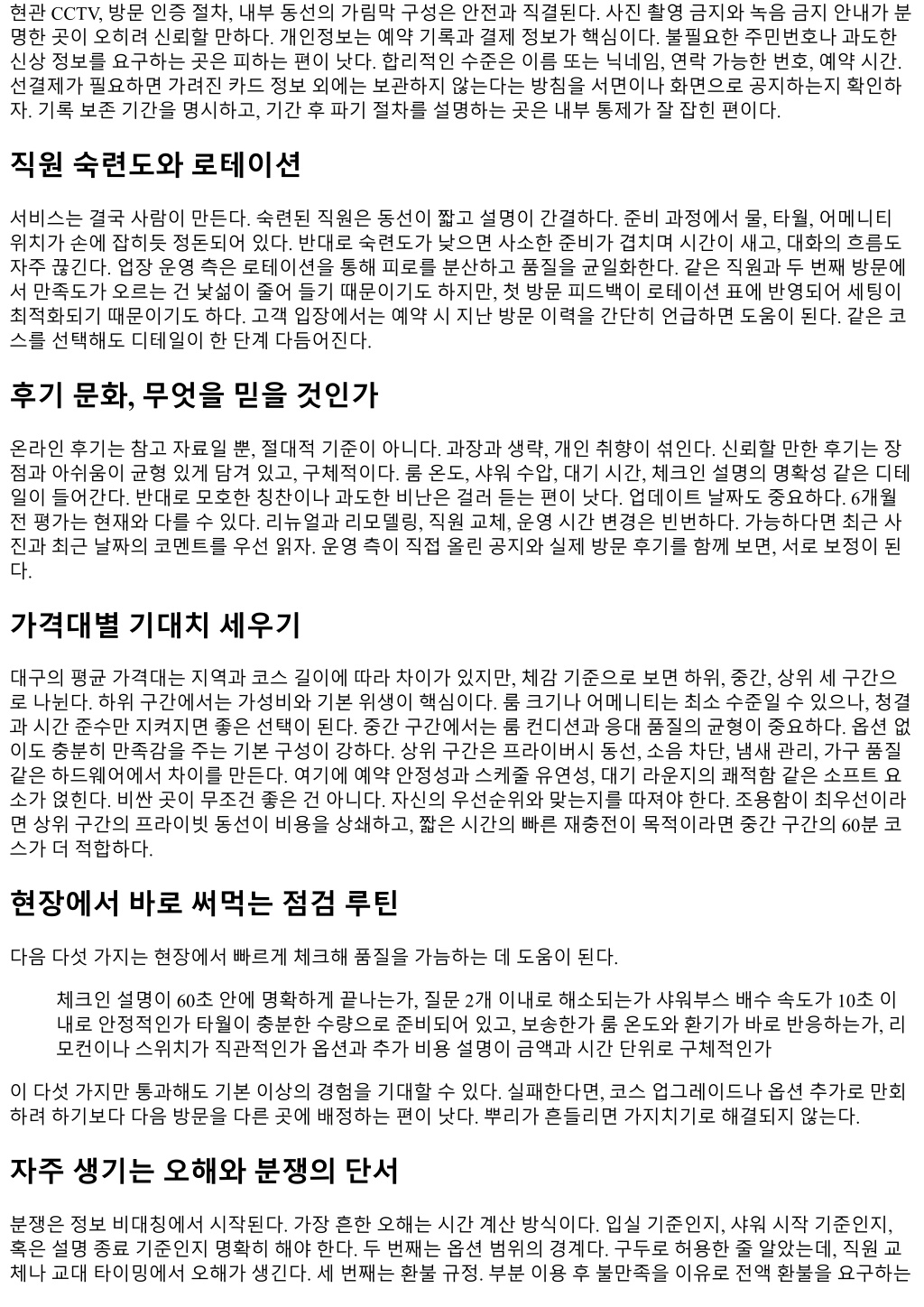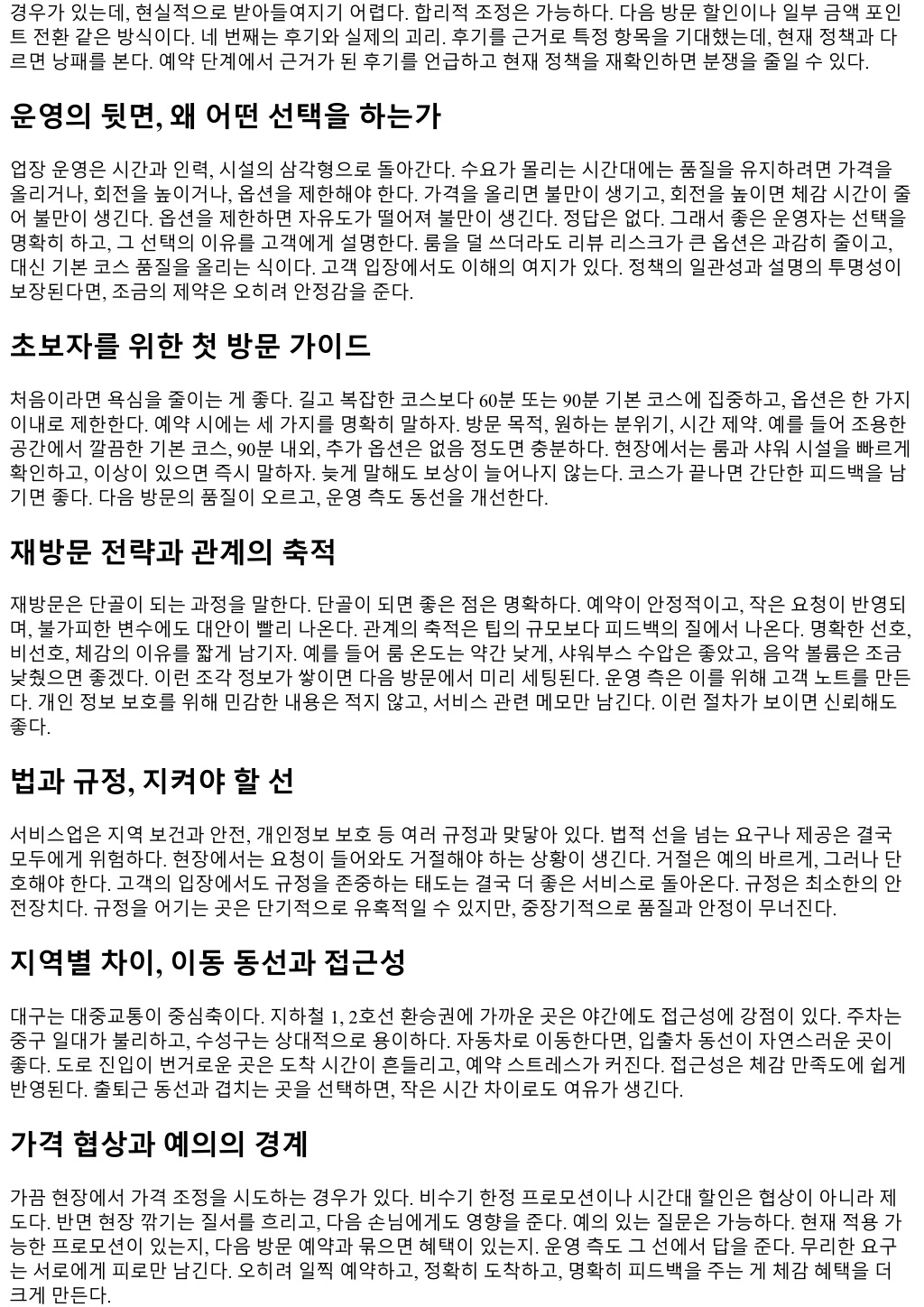 경우가있는데, 현실적으로받아들여지기어렵다. 합리적조정은가능하다. 다음방문할인이나일부금액포인 트전환같은방식이다. 네번째는후기와실제의괴리. 후기를근거로특정항목을기대했는데, 현재정책과다 르면낭패를본다. 예약단계에서근거가된후기를언급하고현재정책을재확인하면분쟁을줄일수있다. 운영의뒷면, 왜어떤선택을하는가 업장운영은시간과인력, 시설의삼각형으로돌아간다. 수요가몰리는시간대에는품질을유지하려면가격을 올리거나, 회전을높이거나, 옵션을제한해야한다. 가격을올리면불만이생기고, 회전을높이면체감시간이줄 어불만이생긴다. 옵션을제한하면자유도가떨어져불만이생긴다. 정답은없다. 그래서좋은운영자는선택을 명확히하고, 그선택의이유를고객에게설명한다. 룸을덜쓰더라도리뷰리스크가큰옵션은과감히줄이고, 대신기본코스품질을올리는식이다. 고객입장에서도이해의여지가있다. 정책의일관성과설명의투명성이 보장된다면, 조금의제약은오히려안정감을준다. 초보자를위한첫방문가이드 처음이라면욕심을줄이는게좋다. 길고복잡한코스보다 60분또는 90분기본코스에집중하고, 옵션은한가지 이내로제한한다. 예약시에는세가지를명확히말하자. 방문목적, 원하는분위기, 시간제약. 예를들어조용한 공간에서깔끔한기본코스, 90분내외, 추가옵션은없음정도면충분하다. 현장에서는룸과샤워시설을빠르게 확인하고, 이상이있으면즉시말하자. 늦게말해도보상이늘어나지않는다. 코스가끝나면간단한피드백을남 기면좋다. 다음방문의품질이오르고, 운영측도동선을개선한다. 재방문전략과관계의축적 재방문은단골이되는과정을말한다. 단골이되면좋은점은명확하다. 예약이안정적이고, 작은요청이반영되 며, 불가피한변수에도대안이빨리나온다. 관계의축적은팁의규모보다피드백의질에서나온다. 명확한선호, 비선호, 체감의이유를짧게남기자. 예를들어룸온도는약간낮게, 샤워부스수압은좋았고, 음악볼륨은조금 낮췄으면좋겠다. 이런조각정보가쌓이면다음방문에서미리세팅된다. 운영측은이를위해고객노트를만든 다. 개인정보보호를위해민감한내용은적지않고, 서비스관련메모만남긴다. 이런절차가보이면신뢰해도 좋다. 법과규정, 지켜야할선 서비스업은지역보건과안전, 개인정보보호등여러규정과맞닿아있다. 법적선을넘는요구나제공은결국 모두에게위험하다. 현장에서는요청이들어와도거절해야하는상황이생긴다. 거절은예의바르게, 그러나단 호해야한다. 고객의입장에서도규정을존중하는태도는결국더좋은서비스로돌아온다. 규정은최소한의안 전장치다. 규정을어기는곳은단기적으로유혹적일수있지만, 중장기적으로품질과안정이무너진다. 지역별차이, 이동동선과접근성 대구는대중교통이중심축이다. 지하철 1, 2호선환승권에가까운곳은야간에도접근성에강점이있다. 주차는 중구일대가불리하고, 수성구는상대적으로용이하다. 자동차로이동한다면, 입출차동선이자연스러운곳이 좋다. 도로진입이번거로운곳은도착시간이흔들리고, 예약스트레스가커진다. 접근성은체감만족도에쉽게 반영된다. 출퇴근동선과겹치는곳을선택하면, 작은시간차이로도여유가생긴다. 가격협상과예의의경계 가끔현장에서가격조정을시도하는경우가있다. 비수기한정프로모션이나시간대할인은협상이아니라제 도다. 반면현장깎기는질서를흐리고, 다음손님에게도영향을준다. 예의있는질문은가능하다. 현재적용가 능한프로모션이있는지, 다음방문예약과묶으면혜택이있는지. 운영측도그선에서답을준다. 무리한요구 는서로에게피로만남긴다. 오히려일찍예약하고, 정확히도착하고, 명확히피드백을주는게체감혜택을더 크게만든다.