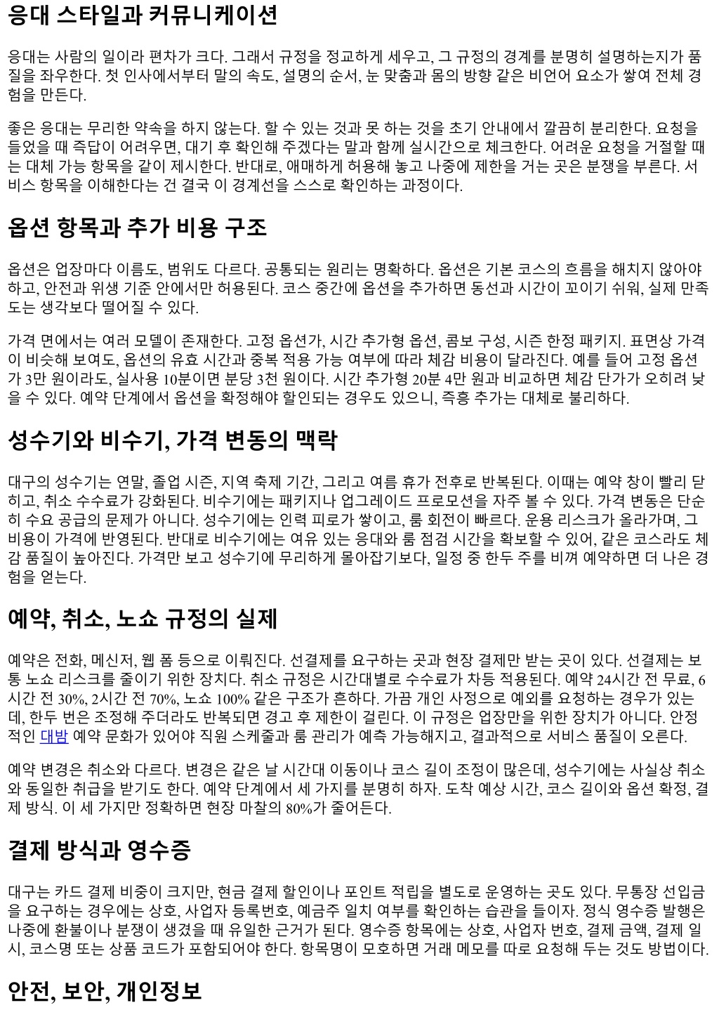 응대스타일과커뮤니케이션 응대는사람의일이라편차가크다. 그래서규정을정교하게세우고, 그규정의경계를분명히설명하는지가품 질을좌우한다. 첫인사에서부터말의속도, 설명의순서, 눈맞춤과몸의방향같은비언어요소가쌓여전체경 험을만든다. 좋은응대는무리한약속을하지않는다. 할수있는것과못하는것을초기안내에서깔끔히분리한다. 요청을 들었을때즉답이어려우면, 대기후확인해주겠다는말과함께실시간으로체크한다. 어려운요청을거절할때 는대체가능항목을같이제시한다. 반대로, 애매하게허용해놓고나중에제한을거는곳은분쟁을부른다. 서 비스항목을이해한다는건결국이경계선을스스로확인하는과정이다. 옵션항목과추가비용구조 옵션은업장마다이름도, 범위도다르다. 공통되는원리는명확하다. 옵션은기본코스의흐름을해치지않아야 하고, 안전과위생기준안에서만허용된다. 코스중간에옵션을추가하면동선과시간이꼬이기쉬워, 실제만족 도는생각보다떨어질수있다. 가격면에서는여러모델이존재한다. 고정옵션가, 시간추가형옵션, 콤보구성, 시즌한정패키지. 표면상가격 이비슷해보여도, 옵션의유효시간과중복적용가능여부에따라체감비용이달라진다. 예를들어고정옵션 가 3만원이라도, 실사용 10분이면분당 3천원이다. 시간추가형 20분 4만원과비교하면체감단가가오히려낮 을수있다. 예약단계에서옵션을확정해야할인되는경우도있으니, 즉흥추가는대체로불리하다. 성수기와비수기, 가격변동의맥락 대구의성수기는연말, 졸업시즌, 지역축제기간, 그리고여름휴가전후로반복된다. 이때는예약창이빨리닫 히고, 취소수수료가강화된다. 비수기에는패키지나업그레이드프로모션을자주볼수있다. 가격변동은단순 히수요공급의문제가아니다. 성수기에는인력피로가쌓이고, 룸회전이빠르다. 운용리스크가올라가며, 그 비용이가격에반영된다. 반대로비수기에는여유있는응대와룸점검시간을확보할수있어, 같은코스라도체 감품질이높아진다. 가격만보고성수기에무리하게몰아잡기보다, 일정중한두주를비껴예약하면더나은경 험을얻는다. 예약, 취소, 노쇼규정의실제 예약은전화, 메신저, 웹폼등으로이뤄진다. 선결제를요구하는곳과현장결제만받는곳이있다. 선결제는보 통노쇼리스크를줄이기위한장치다. 취소규정은시간대별로수수료가차등적용된다. 예약 24시간전무료, 6 시간전 30%, 2시간전 70%, 노쇼 100% 같은구조가흔하다. 가끔개인사정으로예외를요청하는경우가있는 데, 한두번은조정해주더라도반복되면경고후제한이걸린다. 이규정은업장만을위한장치가아니다. 안정 적인대밤예약문화가있어야직원스케줄과룸관리가예측가능해지고, 결과적으로서비스품질이오른다. 예약변경은취소와다르다. 변경은같은날시간대이동이나코스길이조정이많은데, 성수기에는사실상취소 와동일한취급을받기도한다. 예약단계에서세가지를분명히하자. 도착예상시간, 코스길이와옵션확정, 결 제방식. 이세가지만정확하면현장마찰의 80%가줄어든다. 결제방식과영수증 대구는카드결제비중이크지만, 현금결제할인이나포인트적립을별도로운영하는곳도있다. 무통장선입금 을요구하는경우에는상호, 사업자등록번호, 예금주일치여부를확인하는습관을들이자. 정식영수증발행은 나중에환불이나분쟁이생겼을때유일한근거가된다. 영수증항목에는상호, 사업자번호, 결제금액, 결제일 시, 코스명또는상품코드가포함되어야한다. 항목명이모호하면거래메모를따로요청해두는것도방법이다. 안전, 보안, 개인정보