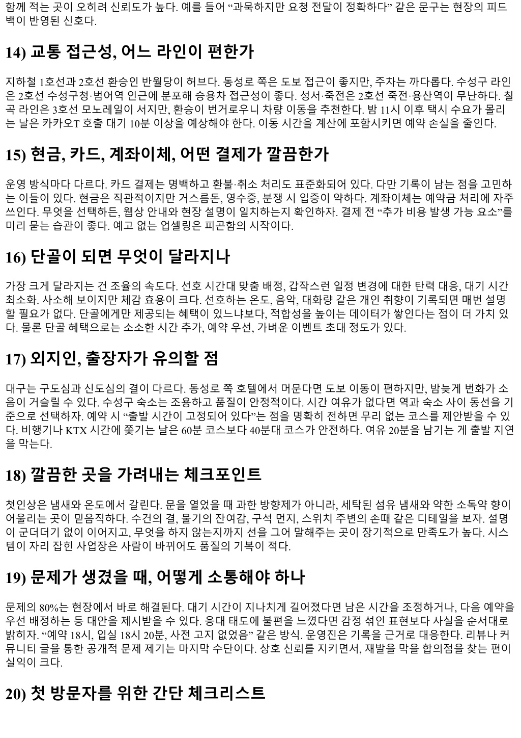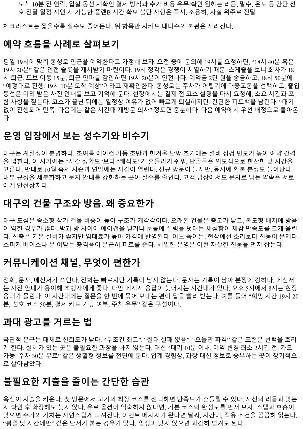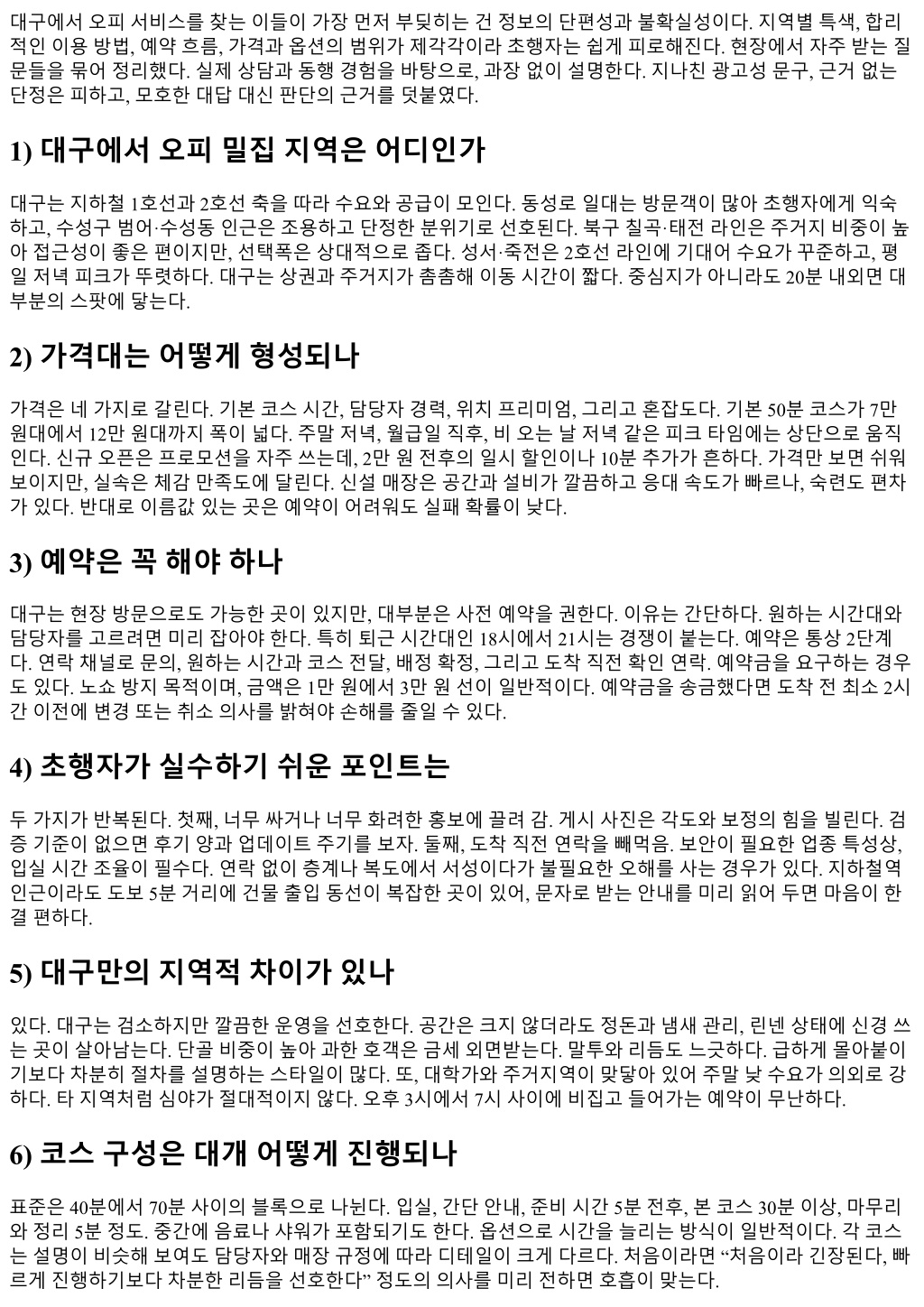 함께적는곳이오히려신뢰도가높다. 예를들어 “과묵하지만요청전달이정확하다” 같은문구는현장의피드 백이반영된신호다. 14) 교통접근성, 어느라인이편한가 지하철 1호선과 2호선환승인반월당이허브다. 동성로쪽은도보접근이좋지만, 주차는까다롭다. 수성구라인 은 2호선수성구청·범어역인근에분포해승용차접근성이좋다. 성서·죽전은 2호선죽전·용산역이무난하다. 칠 곡라인은 3호선모노레일이서지만, 환승이번거로우니차량이동을추천한다. 밤 11시이후택시수요가몰리 는날은카카오T 호출대기 10분이상을예상해야한다. 이동시간을계산에포함시키면예약손실을줄인다. 15) 현금, 카드, 계좌이체, 어떤결제가깔끔한가 운영방식마다다르다. 카드결제는명백하고환불·취소처리도표준화되어있다. 다만기록이남는점을고민하 는이들이있다. 현금은직관적이지만거스름돈, 영수증, 분쟁시입증이약하다. 계좌이체는예약금처리에자주 쓰인다. 무엇을선택하든, 웹상안내와현장설명이일치하는지확인하자. 결제전 “추가비용발생가능요소”를 미리묻는습관이좋다. 예고없는업셀링은피곤함의시작이다. 16) 단골이되면무엇이달라지나 가장크게달라지는건조율의속도다. 선호시간대맞춤배정, 갑작스런일정변경에대한탄력대응, 대기시간 최소화. 사소해보이지만체감효용이크다. 선호하는온도, 음악, 대화량같은개인취향이기록되면매번설명 할필요가없다. 단골에게만제공되는혜택이있느냐보다, 적합성을높이는데이터가쌓인다는점이더가치있 다. 물론단골혜택으로는소소한시간추가, 예약우선, 가벼운이벤트초대정도가있다. 17) 외지인, 출장자가유의할점 대구는구도심과신도심의결이다르다. 동성로쪽호텔에서머문다면도보이동이편하지만, 밤늦게번화가소 음이거슬릴수있다. 수성구숙소는조용하고품질이안정적이다. 시간여유가없다면역과숙소사이동선을기 준으로선택하자. 예약시 “출발시간이고정되어있다”는점을명확히전하면무리없는코스를제안받을수있 다. 비행기나 KTX 시간에쫓기는날은 60분코스보다 40분대코스가안전하다. 여유 20분을남기는게출발지연 을막는다. 18) 깔끔한곳을가려내는체크포인트 첫인상은냄새와온도에서갈린다. 문을열었을때과한방향제가아니라, 세탁된섬유냄새와약한소독약향이 어울리는곳이믿음직하다. 수건의결, 물기의잔여감, 구석먼지, 스위치주변의손때같은디테일을보자. 설명 이군더더기없이이어지고, 무엇을하지않는지까지선을그어말해주는곳이장기적으로만족도가높다. 시스 템이자리잡힌사업장은사람이바뀌어도품질의기복이적다. 19) 문제가생겼을때, 어떻게소통해야하나 문제의 80%는현장에서바로해결된다. 대기시간이지나치게길어졌다면남은시간을조정하거나, 다음예약을 우선배정하는등대안을제시받을수있다. 응대태도에불편을느꼈다면감정섞인표현보다사실을순서대로 밝히자. “예약 18시, 입실 18시 20분, 사전고지없었음” 같은방식. 운영진은기록을근거로대응한다. 리뷰나커 뮤니티글을통한공개적문제제기는마지막수단이다. 상호신뢰를지키면서, 재발을막을합의점을찾는편이 실익이크다. 20) 첫방문자를위한간단체크리스트
