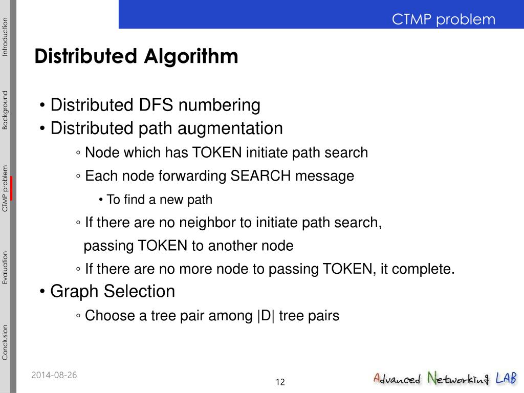Distributed Algorithm • Distributed DFS numbering • Distributed path augmentation • Node which has TOKEN initiate path search • Each node forwarding SEARCH message • To find a new path • If there are no neighbor to initiate path search, passing TOKEN to another node • If there are no more node to passing TOKEN, it complete. • Graph Selection • Choose a tree pair among |D| tree pairs