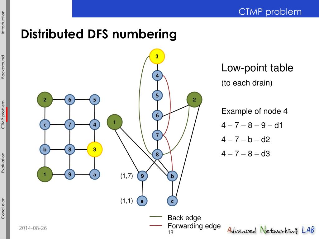 Distributed DFS numbering 3 Low-point table (to each drain) Example of node 4 4 – 7 – 8 – 9 – d1 4 – 7 – b – d2 4 – 7 – 8 – d3 4 5 2 2 6 5 6 1 c 7 4 7 3 b 8 8 1 9 a (1,7) 9 b (1,1) a c Back edge Forwarding edge