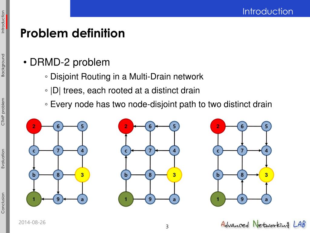 Problem definition • DRMD-2 problem • Disjoint Routing in a Multi-Drain network • |D| trees, each rooted at a distinct drain • Every node has two node-disjoint path to two distinct drain 2 2 2 2 6 5 6 5 6 6 5 5 c 7 4 c 7 4 c c 7 7 4 4 3 3 3 3 b 8 b 8 b b 8 8 1 1 1 1 9 a 9 a 9 9 a a