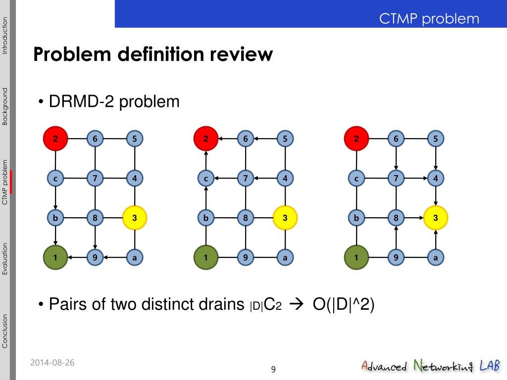 Problem definition review • DRMD-2 problem • Pairs of two distinct drains |D|C2 O(|D|^2) 2 2 2 6 5 6 5 6 5 c 7 4 c 7 4 c 7 4 3 3 3 b 8 b 8 b 8 1 1 1 9 a 9 a 9 a