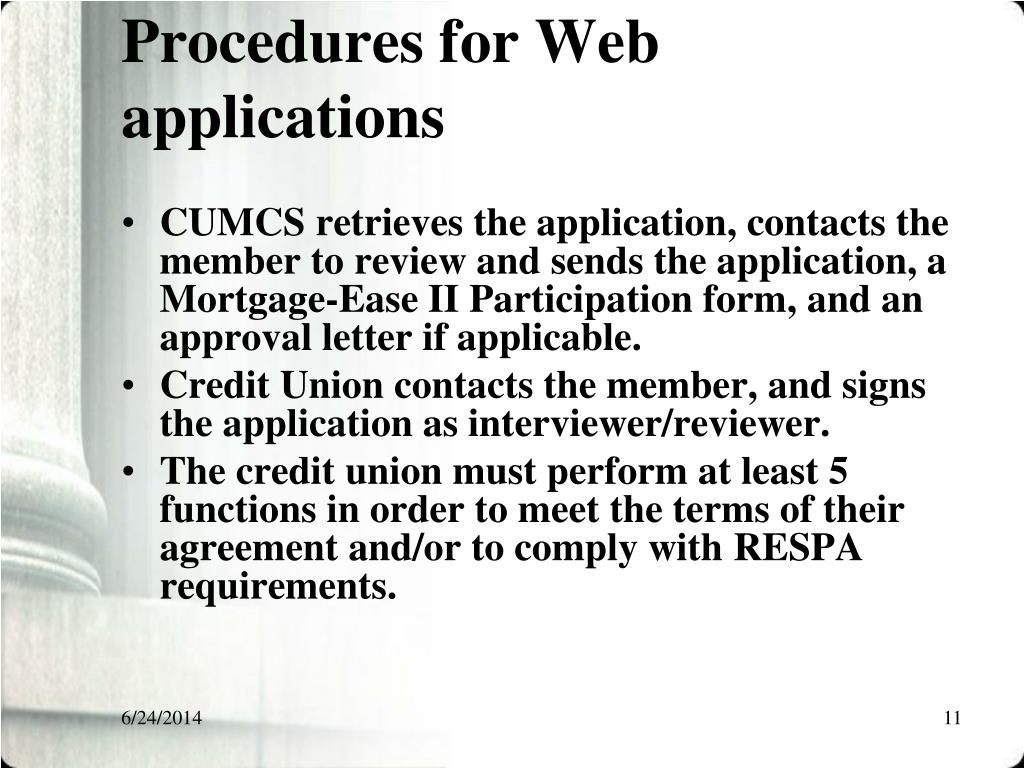 Procedures for Web applications • CUMCS retrieves the application, contacts the member to review and sends the application, a Mortgage-Ease II Participation form, and an approval letter if applicable. • Credit Union contacts the member, and signs the application as interviewer/reviewer. • The credit union must perform at least 5 functions in order to meet the terms of their agreement and/or to comply with RESPA requirements.