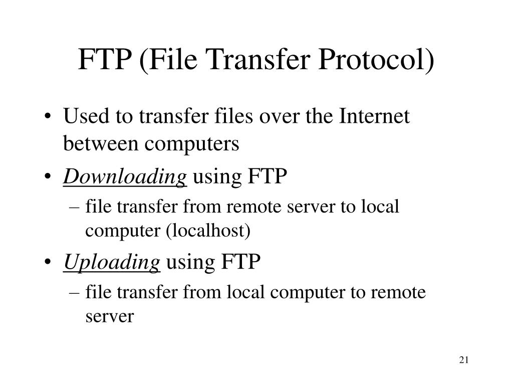 FTP (File Transfer Protocol) • Used to transfer files over the Internet between computers • Downloading using FTP • file transfer from remote server to local computer (localhost) • Uploading using FTP • file transfer from local computer to remote server