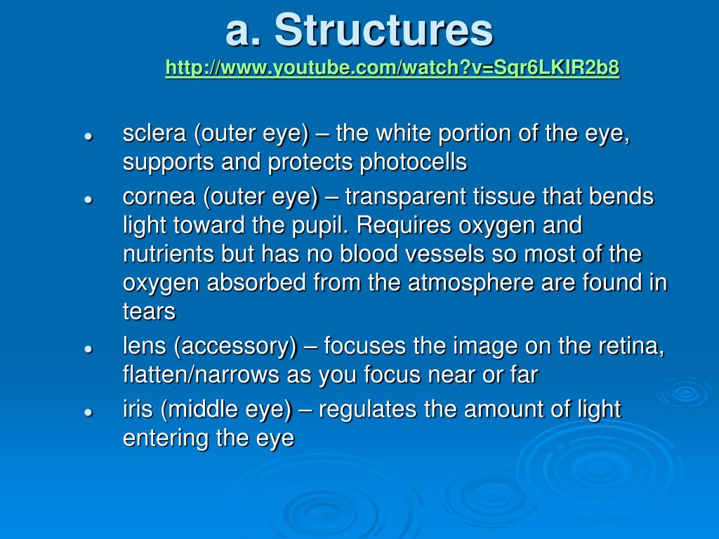 a. Structureshttp://www.youtube.com/watch?v=Sqr6LKIR2b8 • sclera (outer eye) – the white portion of the eye, supports and protects photocells • cornea (outer eye) – transparent tissue that bends light toward the pupil. Requires oxygen and nutrients but has no blood vessels so most of the oxygen absorbed from the atmosphere are found in tears • lens (accessory) – focuses the image on the retina, flatten/narrows as you focus near or far • iris (middle eye) – regulates the amount of light entering the eye