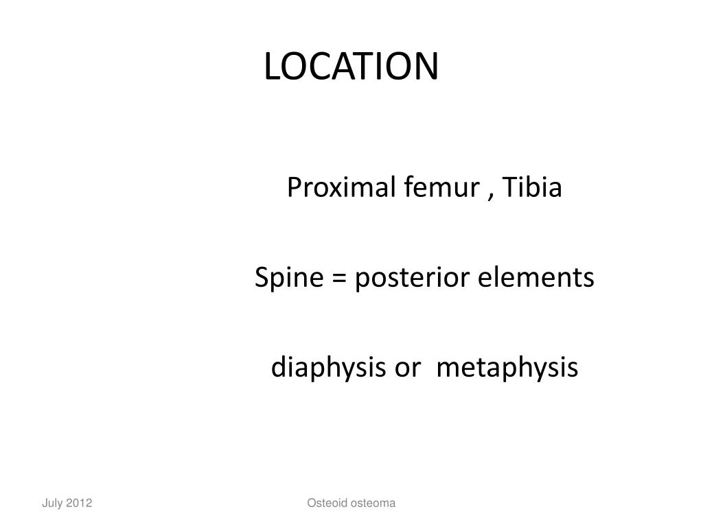 LOCATION Proximal femur , Tibia Spine = posterior elements diaphysis or metaphysis Osteoid osteoma