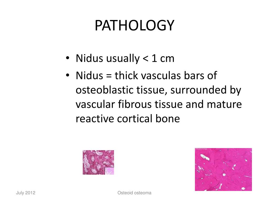 PATHOLOGY • Nidus usually < 1 cm • Nidus = thick vasculas bars of osteoblastic tissue, surrounded by vascular fibrous tissue and mature reactive cortical bone Osteoid osteoma