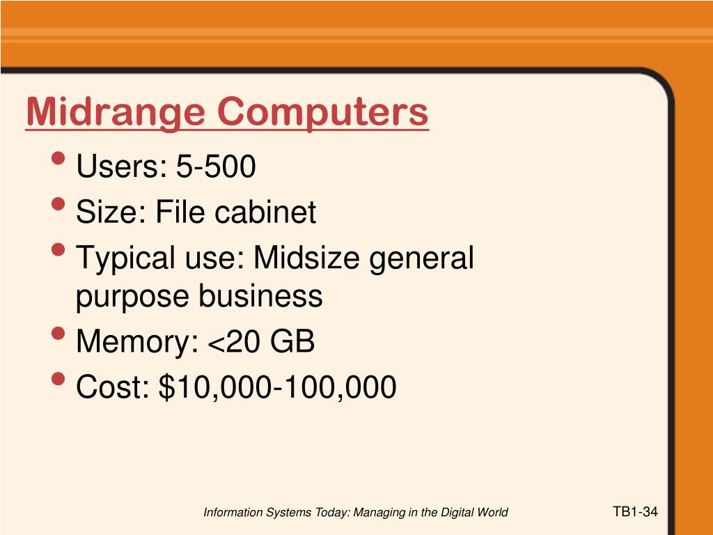 Midrange Computers • Users: 5-500 • Size: File cabinet • Typical use: Midsize general purpose business • Memory: <20 GB • Cost: $10,000-100,000 Information Systems Today: Managing in the Digital World