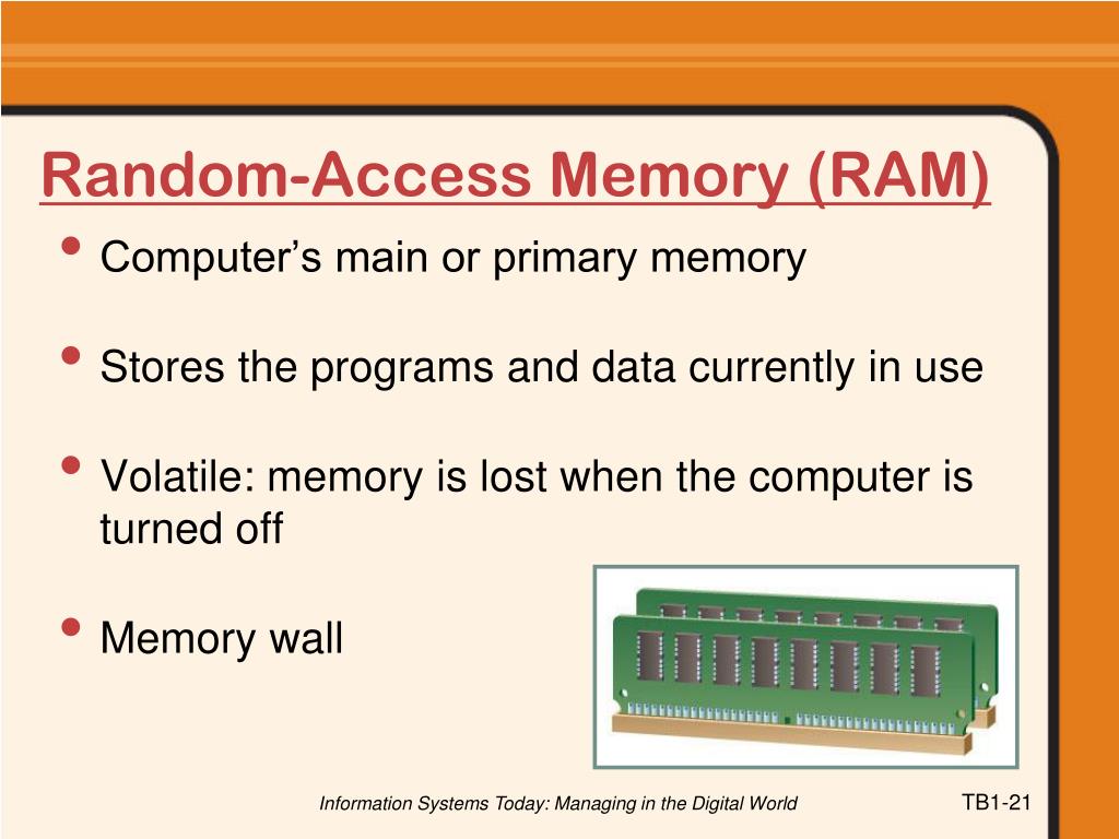 Random-Access Memory (RAM) • Computer’s main or primary memory • Stores the programs and data currently in use • Volatile: memory is lost when the computer is turned off • Memory wall Information Systems Today: Managing in the Digital World