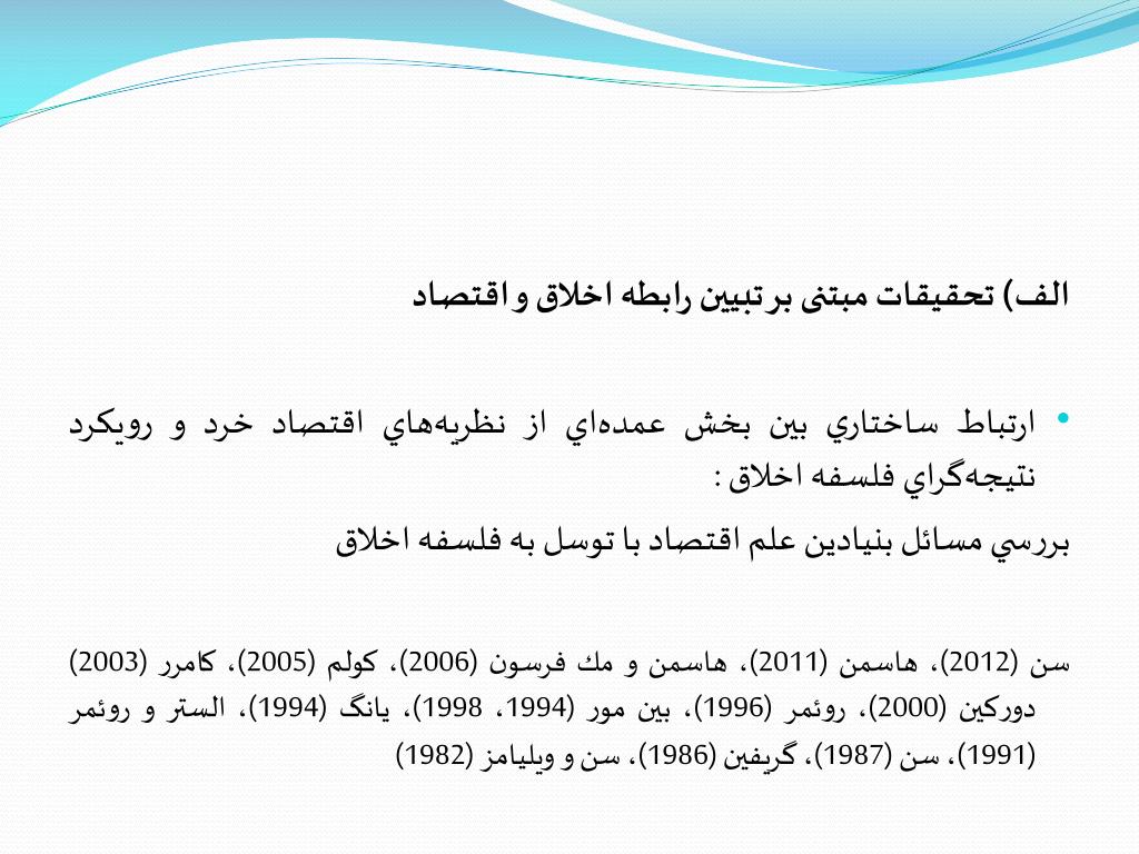 الف) تحقیقات مبتنی بر تبیین رابطه اخلاق و اقتصاد • ارتباط ساختاري بين بخش عمدهاي از نظريههاي اقتصاد خرد و رويكرد نتیجهگراي فلسفه اخلاق : بررسي مسائل بنيادين علم اقتصاد با توسل به فلسفه اخلاق سن (2012)، هاسمن (2011)، هاسمن و مك فرسون (2006)، كولم (2005)، كامرر (2003) دوركين (2000)، روئمر (1996)، بين مور (1994، 1998)، يانگ (1994)، الستر و روئمر (1991)، سن (1987)، گريفين (1986)، سن و ويليامز (1982)
