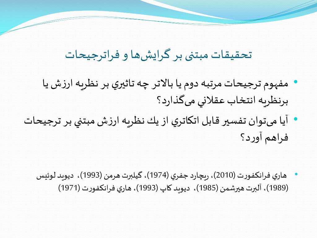 تحقیقات مبتنی بر گرايشها و فراترجيحات • مفهوم ترجيحات مرتبه دوم يا بالاتر چه تاثيري بر نظريه ارزش يا برنظريه انتخاب عقلاني میگذارد؟ • آيا میتوان تفسير قابل اتكاتري از يك نظريه ارزش مبتني بر ترجيحات فراهم آورد؟ • هاري فرانكفورت (2010)، ريچارد جفري (1974)، گيلبرت هرمن (1993)، ديويد لوئيس (1989)، آلبرت هيرشمن (1985)، ديويد كاپ (1993)، هاري فرانكفورت (1971)
