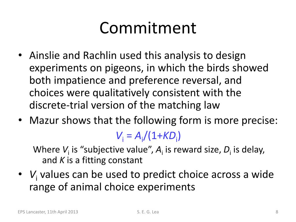 Commitment • Ainslie and Rachlin used this analysis to design experiments on pigeons, in which the birds showed both impatience and preference reversal, and choices were qualitatively consistent with the discrete-trial version of the matching law • Mazur shows that the following form is more precise: Vi = Ai/(1+KDi) Where Vi is “subjective value”, Ai is reward size, Di is delay, and K is a fitting constant • Vi values can be used to predict choice across a wide range of animal choice experiments S. E. G. Lea