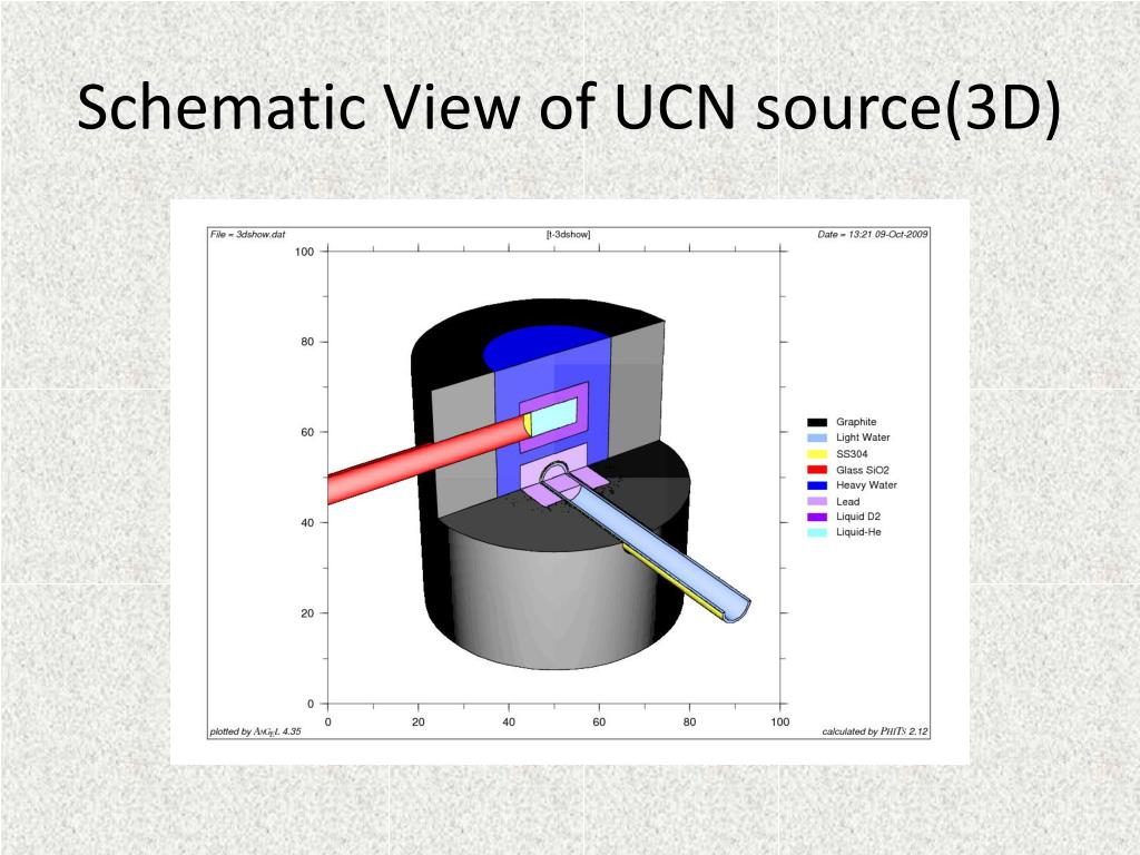 Schematic View of UCN source Target: Lead(φ10cm20cm) Shield: Lead(30cm30cm15cm) Conveter: He-II or D2(φ10cm20cm) 20K Moderator: Liquid D2(φ20cm30cm) 300KModerator: Heavy Water(50cm φ50cm) Reflector: Graphite(100cm φ100cm) by Tyosioka