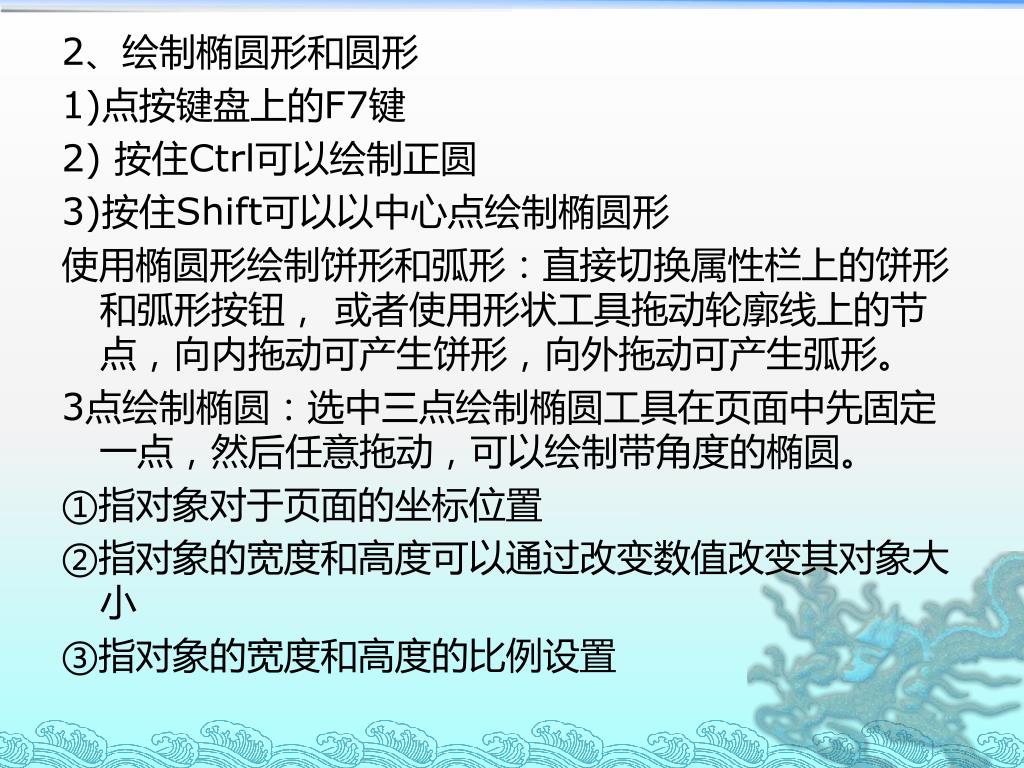 2、绘制椭圆形和圆形 1)点按键盘上的F7键 2)按住Ctrl可以绘制正圆 3)按住Shift可以以中心点绘制椭圆形 使用椭圆形绘制饼形和弧形:直接切换属性栏上的饼形和弧形按钮,或者使用形状工具拖动轮廓线上的节点,向内拖动可产生饼形,向外拖动可产生弧形。 3点绘制椭圆:选中三点绘制椭圆工具在页面中先固定一点,然后任意拖动,可以绘制带角度的椭圆。 ①指对象对于页面的坐标位置 ②指对象的宽度和高度可以通过改变数值改变其对象大小 ③指对象的宽度和高度的比例设置