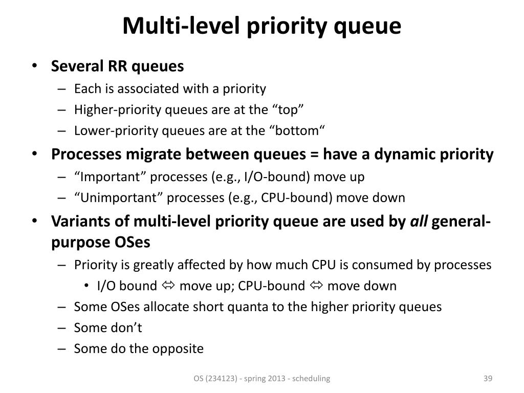 Multi-level priority queue • Several RR queues • Each is associated with a priority • Higher-priority queues are at the “top” • Lower-priority queues are at the “bottom“ • Processes migrate between queues = have a dynamic priority • “Important” processes (e.g., I/O-bound) move up • “Unimportant” processes (e.g., CPU-bound) move down • Variants of multi-level priority queue are used by all general-purpose OSes • Priority is greatly affected by how much CPU is consumed by processes • I/O bound move up; CPU-bound move down • Some OSes allocate short quanta to the higher priority queues • Some don’t • Some do the opposite OS (234123) - spring 2013 - scheduling