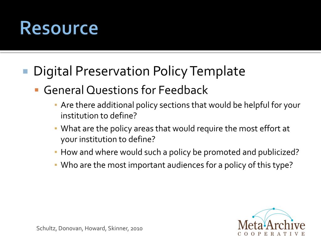 Resource • Digital Preservation Policy Template • General Questions for Feedback • Are there additional policy sections that would be helpful for your institution to define? • What are the policy areas that would require the most effort at your institution to define? • How and where would such a policy be promoted and publicized? • Who are the most important audiences for a policy of this type? Schultz, Donovan, Howard, Skinner, 2010