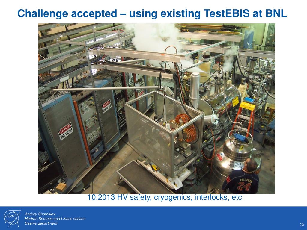 Challenge accepted – using existing TestEBIS at BNL 10.2013 HV safety, cryogenics, interlocks, etc